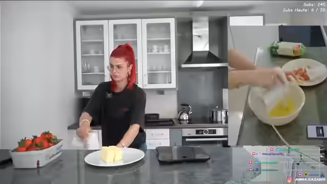 00:17:44Die Streamerin beginnt mit der Vorbereitung des Kuchenteigs. Sie bereitet Ei, Zucker und Vanillezucker in einer Schüssel vor und rührt es schaumig. Dabei hat sie mit einer allergischen Reaktion an der Hand zu kämpfen, die sich stark angeschwollen ist. Trotzdem setzt sie das Backen fort und gibt nach und nach Mehl mit Backpulver hinzu, wobei sie auf die Notwendigkeit des Siebens achtet, um Klumpen zu vermeiden.