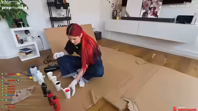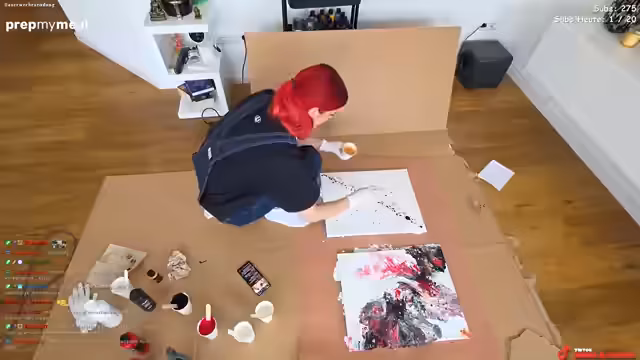01:48:01Der Stream endet mit einer kreativen Malaktion. Die Streaminer bereitet ein Pouring-Bild vor und testet eine neue Arbeitskleidung - eine Latzhose. Sie mischt Farben Weiß, Rot, Schwarz und Gold für ein Bild und bereitet sich auf das Malen mit Föhn vor, um spezielle Effekte zu erzielen. Der Prozess wird humorvoll begleitet und zeigt die Vorbereitung für eine kreative Session mit den Zuschauern.
