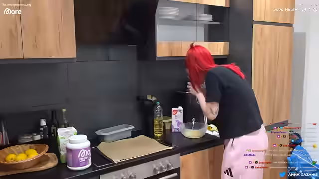 02:34:08Nach den CS-Runden wird die Frage gestellt, ob eine weitere Runde gespielt oder stattdessen Bananenbrot gebacken werden soll. Anna entscheidet sich für das Backen und stellt die Zutaten vor: Bananen, Öl, Mehl, More Nutrition Sahne Protein, Eier, Milch, Zucker und Zartbitterschokolade. Sie erklärt das Rezept mit 180 Grad Ober-Unterhitze und 35 Minuten Backzeit, während sie über ihre zu kleine Küche und den Besuch ihrer Eltern spricht, die gesundes Brot erwarten.