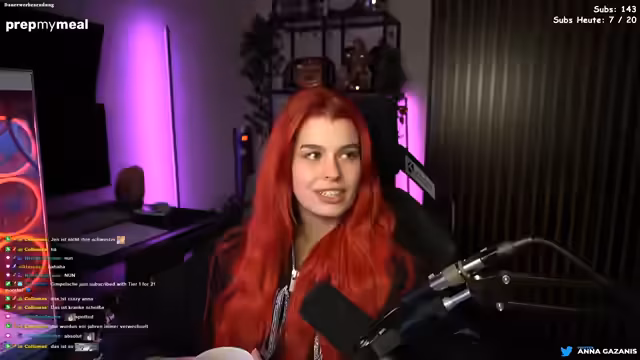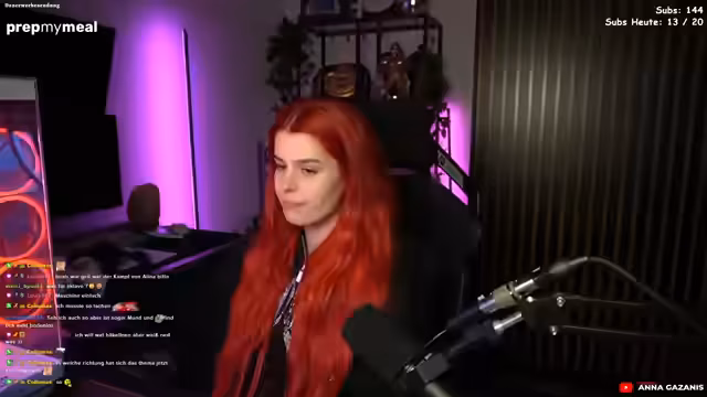 00:01:48Der Stream beginnt mit der traditionellen Begrüßung des Chats. Anna Gazanis spricht über ihre eine Woche Streaming-Pause und erwähnt, dass sie ihr Six-Days-Stream-Projekt nun beendet. Sie teilt persönliche Neuigkeiten mit: sie hat sich beim Sport einen Zahn ausgeschlagen und muss sich einer Operation am Arm unterziehen. Außerdem erwähnt sie, dass sie ihre Haare hat fönen lassen, die Wellen aber wieder herausgewachsen sind und sie sie neu machen muss.
