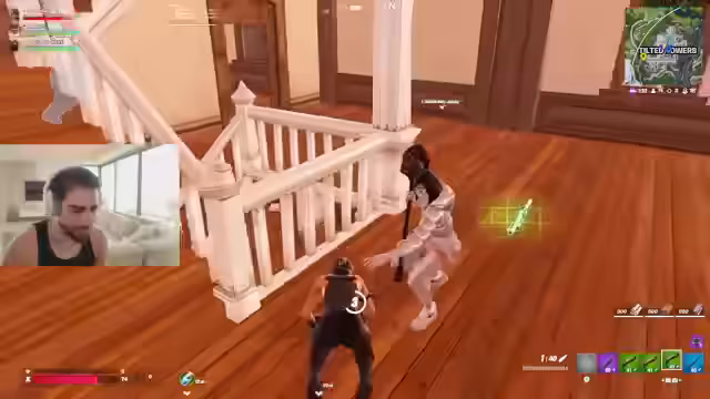 08:38:41Die Stimmung erreicht einen neuen Höhepunkt in einem intensiven Kampf. Der Streamer kämpft mit einem Rocket Launcher, während Cleveland als "High-Ground"-Spieler agiert. Der Gegner wird eliminiert, was zu Jubel im Chat führt. Cleveland wird als "Maschine" und als der beste Spieler gefeiert, der das Spiel für das Team dominiert.