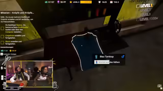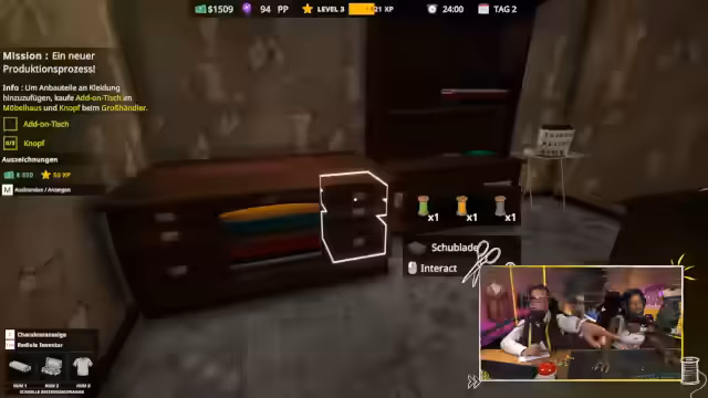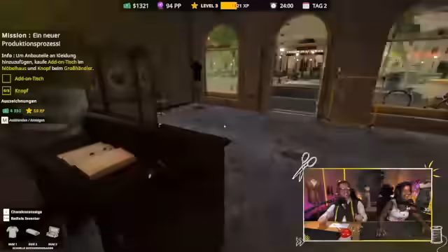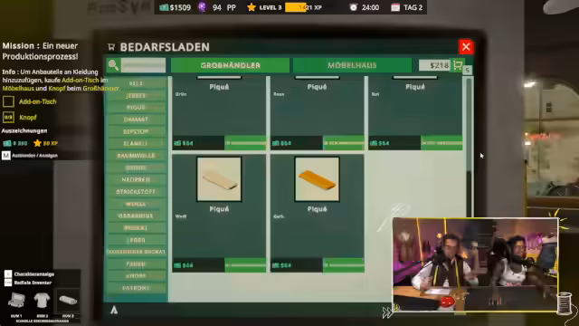 00:35:23Im Stream wird nun ein Schneider-Simulator getestet. Der Gastgeber und die Designerin beginnen, den kleinen Laden im Spiel zu erkunden. Sie erklären die verschiedenen Funktionen, wie das Schneidern von Kleidung und das Bestellen von Materialien. Sie haben erste Aufträge angenommen und müssen nun den Stoff nachbestellen, da der Vorrat zu niedrig ist. Die Designerin gibt Einblicke in verschiedene Stoffarten wie Jersey und Piqué und erklärt die Unterschiede.
