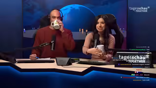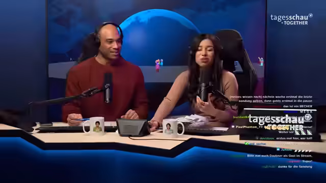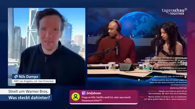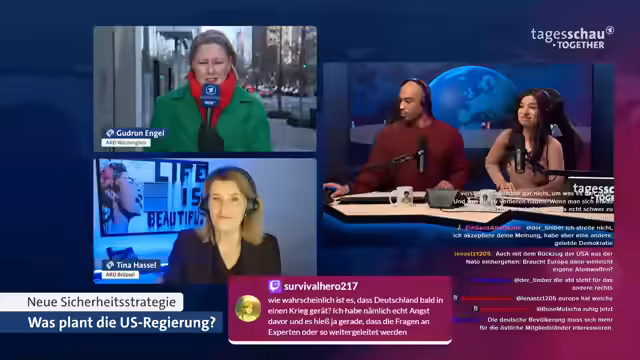 00:10:18Philipp und Hallin heißen die Zuschauer willkommen und kündigen die Hauptthemen des Streams an: die neue US-Sicherheitsstrategie mit ihren Auswirkungen auf Europa sowie den Bieterstreit zwischen Netflix und Paramount um den Hollywood-Konzern Warner Bros. Beide Themen werden als politisch und kulturell bedeutsam eingestuft. Zudem wird die Live-Übertragung der Tagesschau um 20 Uhr angekündigt sowie ein Gewinnspiel erwähnt, das aber inhaltlich ignoriert wird.