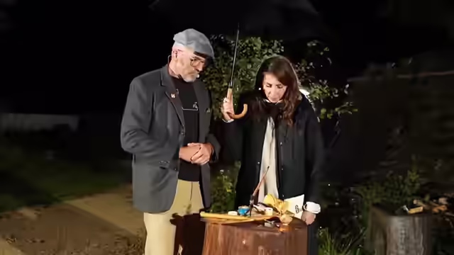 04:06:28Die Teams beginnen, mit Eicheln und Tannenzapfen auf die Burgen des Gegners zu werfen. Nachdem die ersten Geschosse nicht die gewünschte Wirkung zeigen, werden größere Steine eingesetzt. Es wird darauf geachtet, dass die Teams nicht übertreten und die Regeln einhalten. Durch die Würfe verschiebt sich die Position der Burgen leicht. Am Ende wird Team Weid zum Sieger erklärt. Als Preis erhalten sie eine Daumenkanne und ein Steinbeil. Team Krab erhält als Trostpreis eine Umarmung für ihren Einsatz und ihre Mühe. Abschließend bedanken sich die Moderatoren bei allen Beteiligten, einschließlich des Teams hinter der Kamera, dem SWR und dem Publikum.