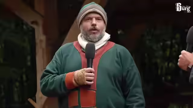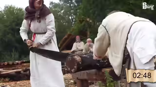 00:42:38Nach der ersten Roblox-Runde, die für beide Teams ohne Punkte endete, wird die erste IRL-Challenge angekündigt. André führt zum Platz der ersten Challenge, der Holzwerkstatt Campus Galli. Im Frühmittelalter war Holz der wichtigste Baustoff, insbesondere für Gebäude, während Stein hauptsächlich für Großprojekte wie Klöster verwendet wurde. Im Gegensatz zur heutigen Holzverarbeitung mit Kreissägen wurde Holz im Frühmittelalter hauptsächlich gespalten. André zeigt einen Dachstuhl, der ohne Sägen, sondern durch Spalten und Zusammenstecken mit Holznägeln gefertigt wurde. Das Spalten war einfacher und kostengünstiger als das Sägen, da Sägen teuer in der Herstellung waren. Michael aus der Holzwerkstatt erklärt die Herstellung von Dauben für Eimer und Gefäße. Im Mittelalter waren Holzbecher üblich, und die Dauben wurden traditionell gespalten statt gesägt. Michael demonstriert das Spalten von Holz mit Keilen. André zeigt eine Stollentruhe, die komplett aus gespaltenen Brettern ohne Metall gefertigt ist. Solche Truhen waren weit verbreitet und dienten zur Aufbewahrung von Werkzeugen und Kleidung. Michael erklärt, dass fast alles auf der Baustelle aus Holz gefertigt werden kann, bis auf die Eisenwerkzeuge. Er betont, dass die Menschen im Frühmittelalter ein tiefes Verständnis für Holz hatten und wussten, welche Holzart für welchen Zweck geeignet ist. Als Beispiel für eine ungewöhnliche Holzarbeit zeigt er einen Spaten aus Holz, bei dem nur die Spitze mit Metall beschlagen ist.
