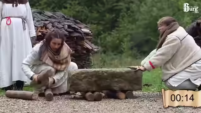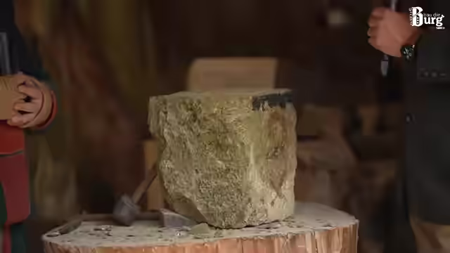 01:38:03Jens erklärt, dass das Mauerwerk hauptsächlich aus Bruchsteinen besteht, die von Maurern zurechtgepuzzelt werden müssen. Er fertigt Mauerecken und Steine für Türrahmen und Türgewände an. Es wird betont, dass Steinmetzarbeit ohne Stahlwerkzeuge schwierig wäre. Jens demonstriert, wie eine Steinfläche bearbeitet wird, beginnend mit dem Anlegen einer geraden Fläche. Er erklärt den Prozess des Abtragens von Buckeln mit einem Spitzmeißel und das Glätten mit einem Steinbeil. Der Buckelquader wird als Halbfabrikat bezeichnet, bei dem man sich das Wegnehmen des Buckels gespart hat. Es wird ein Steinbeil gezeigt und dessen Verwendung erklärt. Es wird festgestellt, dass die ersten Steingebäude gebaut werden und in Zukunft mehr Steinmetze benötigt werden.