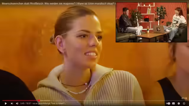 00:37:31Die Diskussion dreht sich um moralische Dilemmata im Zusammenhang mit dem Töten von Tieren zum Verzehr. Es wird das Miet-Paradoxon angesprochen, das die Ambivalenz der Menschen gegenüber Tierleid und Fleischkonsum beschreibt. Es wird überlegt, ob es in Ordnung wäre, Fische zu schlachten. Oleg erzählt von einer Erfahrung in Kirgisistan, wo er einen Fisch mit einem Hammer töten sollte. Er war zu sanft. Er erzählt, dass er als Kind Pazifist war. Er hat Fische gefangen und wieder zurückgeworfen. Oleg erzählt von seinen früheren Haustieren, einem Papagei namens Toscha und einer Wasserschildkröte, die er am Strand in der Ukraine gekauft hat. Beide Tiere wurden ihm weggenommen. Es wird über die Empfindungsfähigkeit von Tieren diskutiert und ob man eher eine Kuh als viele Meerschweinchen essen würde. Es wird über soziale Bindungen zu Tieren gesprochen und warum manche Tiere als Haustiere und andere als Nutztiere gehalten werden. Es wird gefragt, ob man Katzenmilch oder Menschenmilch trinken würde.
