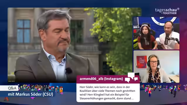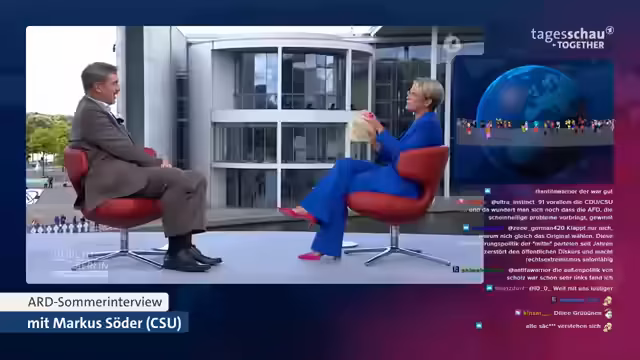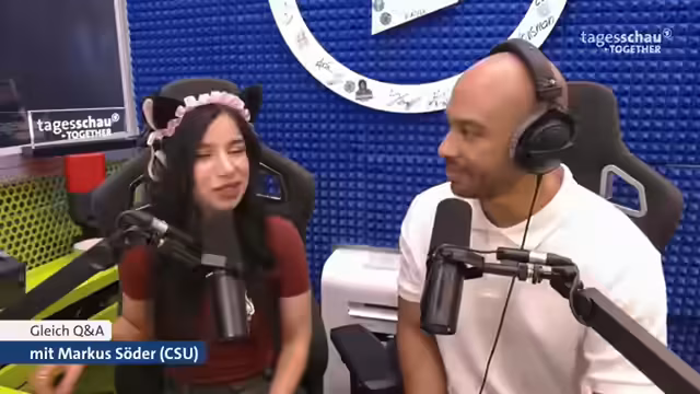 00:56:40Die Moderatoren wechseln vom Thema E-Sport zur Bundespolitik und stellen das bevorstehende ARD-Sommerinterview mit Markus Söder, dem CSU-Chef, vor. Sie korrigieren sich bezüglich der Partei (CSU, nicht CDU) und schalten Stefanie Strauss vom ARD-Hauptstadtstudio als Expertin für die CSU und Markus Söder ein, um über die drängenden Themen zu sprechen, die die Partei beschäftigen.