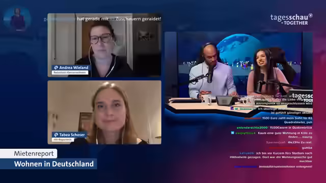 00:10:27Der Stream 'tagesschau together' wird mit den Moderatoren Felix und Anin gestartet. Nach der Begrüßung der Zuschauer wird die Agenda vorgestellt. Es sollen zwei aktuelle Themen behandelt werden: das Sicherheitsgefühl der Menschen in Deutschland basierend auf einem ARD Deutschland Trend und der Mietenreport. Des Weiteren wird ein großes Gewinnspiel angekündigt, bei dem Susanne-Daubner-Tassen verlost werden.