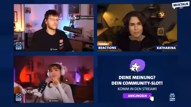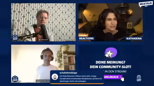 00:10:17Die Streamerin Katharina begrüßt die Zuschauer zu einem neuen MixTalk auf dem ARD-Kanal nach einer kurzen Auszeit. Sie stellt ein neues Studio und das heutige kontroverses Thema vor: Reactions – Mehrwert oder unfair? Der Anlass ist die aktuelle Debatte zwischen Papa Platte und dessen Reaction-Cutter Paul. Die Zuschauer werden eingeladen, via Stream Together teilzunehmen, ihre Meinung zu hinterlassen oder Fragen an die Gäste zu stellen. Es wird betont, dass es sich um ein erfolgreiches und weit verbreitetes Format handelt, dessen genaue Reichweite schwer zu fassen ist.