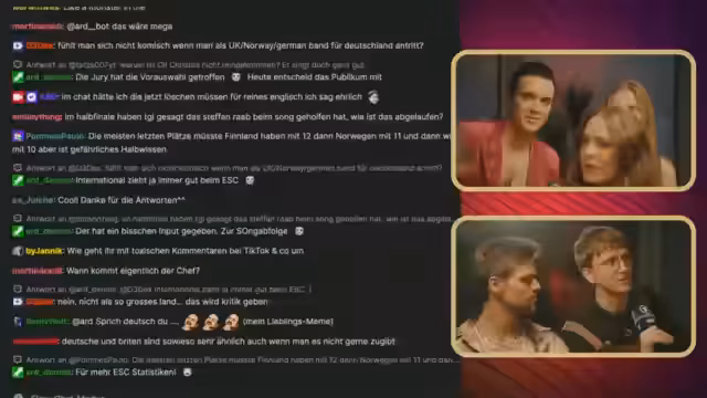 01:03:06Die Band Feuerschwanz wird als erster Act aus Franken beim ESC vorgestellt. Sie sprechen über die fränkische Kultur und ihr Lieblingswort auf Fränkisch. Die Bandmitglieder Johanna und Hodi erzählen, wie sie zu ihren Bandnamen kamen und wie es ist, als Frau in einer von Männern dominierten Szene wie Mittelaltermärkten und Wacken zu agieren. Es wird auf die praktischen Aspekte ihrer Bühnenoutfits eingegangen, insbesondere auf die Reinigung der Rüstungen, die überraschenderweise in der Waschmaschine gereinigt werden können, während Leder spezielle Pflege benötigt. Johanna spricht über die Herausforderungen des schnellen Kostümwechsels während der Show und die damit verbundenen logistischen und stilistischen Überlegungen. Hodi teilt seinen wiederkehrenden Albtraum von einem verpatzten Bühnenauftritt aufgrund von Problemen mit der Rüstung. Die Band äußert den Wunsch, eines Tages im Wembley-Stadion oder auf dem Mount Everest aufzutreten. Es wird auf Kommentare im Chat eingegangen, die die Outfits der Band loben und auf Ritterthemen bei anderen ESC-Beiträgen hinweisen. Feuerschwanz wird humorvoll nach ihren diplomatischen Fähigkeiten bezüglich der Tonabmischung der Show befragt, wobei sie ehrlich auf die Probleme der Vorwoche eingehen. Abschließend werden sie nach ihrer Meinung zu anderen ESC-Acts und ungewöhnlichen Getränken wie Milchshakes gefragt, wobei sie einen Schuss Met anbieten. Es wird auch auf Wortwitze im Chat eingegangen, die sich auf das Thema Ritter und Rüstung beziehen.