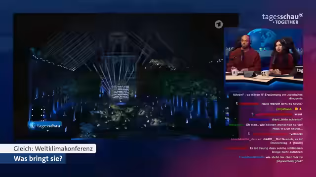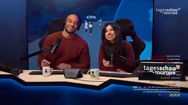 00:10:25Hanin und Felix begrüßen die Zuschauer zu „Tagesschau Together“, dem interaktiven Community-Format der Tagesschau. Sie kündigen zwei relevante Themen der Woche an: die Weltklimakonferenz COP 30 in Belém, Brasilien, und die Sicherheitslage auf deutschen Weihnachtsmärkten. Zudem wird ein Gewinnspiel vorgestellt und die gemeinsame Ausstrahlung der Tagesschau um 20 Uhr erwähnt. Das Format ist live auf verschiedenen Plattformen wie Twitch, TikTok, Instagram, YouTube und in der ARD Mediathek verfügbar, wobei die Zuschauer interaktiv per Mail oder Fax (mit Kanalpunkten auf Twitch) teilnehmen können. Es wird auch auf die Möglichkeit hingewiesen, sich als Avatar im Stream zu präsentieren und die Bedeutung von Channel Points für die Teilnahme am Gewinnspiel wird erklärt.