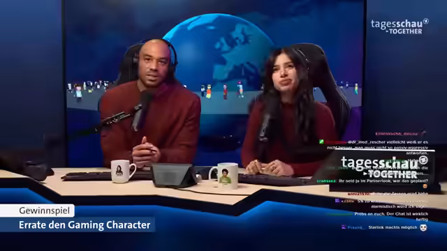 00:48:01Hanin und Felix begrüßen die Zuschauer zurück bei Tagesschau Together, insbesondere die neuen Zuschauer, die von der 20-Uhr-Tagesschau dazugekommen sind. Sie wiederholen die Plattformen, auf denen der Stream verfügbar ist (Twitch, TikTok, Instagram, YouTube, ARD Mediathek) und die Möglichkeit, per Mail zu interagieren. Die Hauptthemen des Streams, die Weltklimakonferenz in Belém, Brasilien, und die Sicherheitslage auf Weihnachtsmärkten, werden erneut genannt. Anschließend wird das Gewinnspiel detaillierter erklärt: Zuschauer können eine doppelseitig bedruckte Susanne-Daubner-Tasse gewinnen, indem sie einen Gaming-Charakter erraten. Dafür werden drei Hinweise im Laufe des Streams gegeben. Die Teilnahme erfordert 300 Channel Points pro Fax, die man durch das Folgen des ARD Twitch-Kanals erhält, und jeder Teilnehmer hat maximal fünf Faxe.
