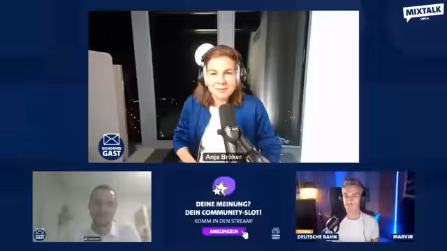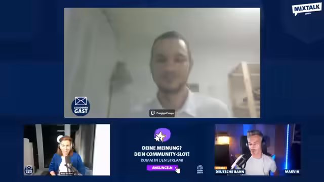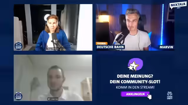 00:09:27Der MixTalk bei der ARD wird eröffnet und begrüßt die Zuschauer. Als Hauptthema wird die Deutsche Bahn und die Frage aufgeworfen, was sich ändern muss, thematisiert. Die Hosts fordern die Zuschauer auf, ihre eigenen Erfahrungen mit der Bahn zu teilen, sowohl positive als auch negative, um eine Diskussion zu initiieren.