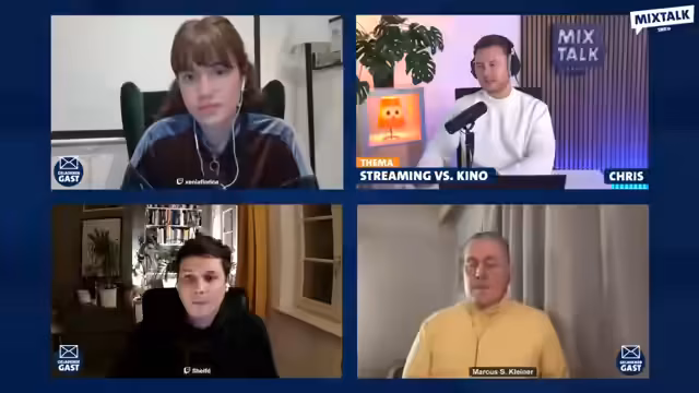 00:14:21Der Stream mit dem Titel 'MixTalk ! Killt Streaming das Kino?' beginnt um 20:30 Uhr auf dem ARD-Twitch-Kanal. Der Moderator begrüßt das Publikum und wünscht ein verspätetes frohes neues Jahr. Er stellt die Runde vor und kündigt an, dass heute die Frage im Fokus steht, ob Streaming das Kino ersetzt. Persönlich gibt der Moderator an, früher ein großer Kinoliebhaber zu sein, sich aber aufgrund von gestiegenen Preisen und Zuschauermassen mehr Richtung Streaming verändert zu haben. Er initiiert eine Abfrage im Chat, ob die Zuschauer eher Team Couch oder Team Kino sind und überrascht, dass viele im Chat noch dem Kino die Treue halten.