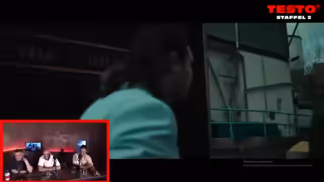 01:47:14Der Stream wechselt zum Hauptformat: der exklusiven Watch-Party von 'Testo 2'. Mit der Tastatur können die Zuschauer die Serie steuern. Direkt im ersten Moment werden die kreativen Freiheiten und die Professionalität der Darsteller, insbesondere in der Verwandlungsszene, von den Hosts gelobt. Die Dreharbeiten in Leipzig und der Einsatz von Action-Elementen werden thematisiert.