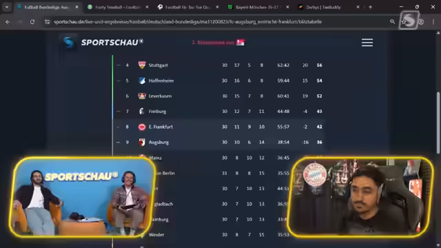 02:28:41Während des Streams werden die anderen Bundesligaspiele live begleitet. In Augsburg gelingt der FCA gegen Frankfurt in der 66. Minute durch Ritz Doorn den Ausgleich zum 1:1. In Mainz dreht der FC Bayern nach einem 0:3-Rückstand gegen die Mainzer ein sensationelles Spiel und gewinnt schließlich mit 4:3 durch Tore von Ullisse, Musiala und Kane. In Wolfsburg und Gladbach bleibt es torlos, da es zu Platzverweis bei Gladbach kam. Heidenheim siegt gegen St. Pauli mit 2:0 und bleibt im Abstiegskampf drin.