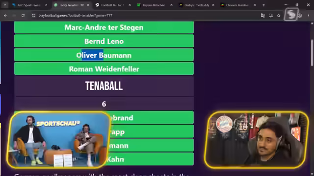 01:16:46Zwischen den Spielphasen veranstalten die Streamer ein 'Tennerball'-Quiz mit dem Publikum. Die Aufgabe besteht darin, zehn deutsche Torhüter der letzten 20 Jahre zu nennen, die die meisten 'Clean Sheets' in den Top-Ligen Europas erzielt haben. Nach einigen Versuchen und Fehlversuchen wird die endgültige Liste erstellt. Das Quiz bietet eine willkommene Unterhaltungs- und Ablenkungspause von den Spielszenen.