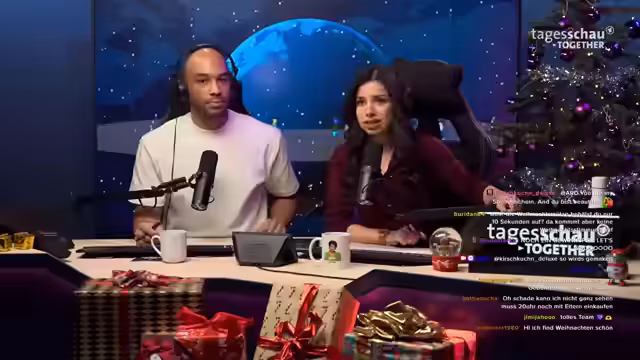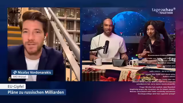 00:10:28Hanin und Felix begrüßen die Zuschauer zu einer neuen Ausgabe von Tagesschau Together, dem interaktiven Community-Format der Tagesschau. Sie kündigen an, zwei tagesaktuelle Themen mit Korrespondenten zu besprechen und gemeinsam die Tagesschau um 20 Uhr zu schauen. Ein besonderes Highlight ist ein XXL-Weihnachtsgewinnspiel. Die Hauptthemen des Abends sind der EU-Gipfel, bei dem es um die künftige Unterstützung der Ukraine und die Verwendung von eingefrorenem russischem Vermögen geht, sowie die aktuelle Lage in Nahost. Die Moderatoren stimmen die Community auf die vorweihnachtliche Zeit ein und freuen sich über die rege Beteiligung im Chat. Der Stream ist bis 21:30 Uhr angesetzt, wobei die Teilnahme am Gewinnspiel eine Präsenz im Chat erfordert, um im Falle eines Gewinns erneut ziehen zu müssen. Die marokkanische Losschüssel wird später für das Gewinnspiel zum Einsatz kommen.