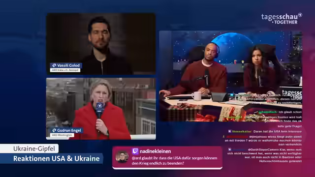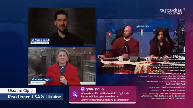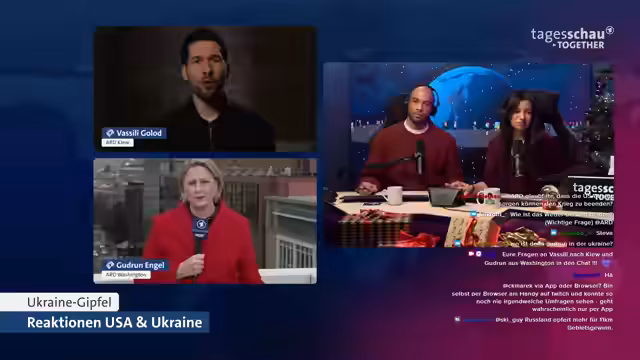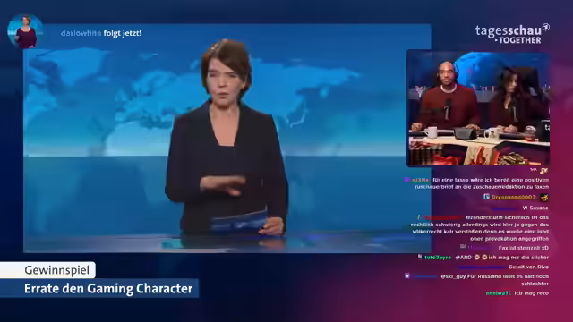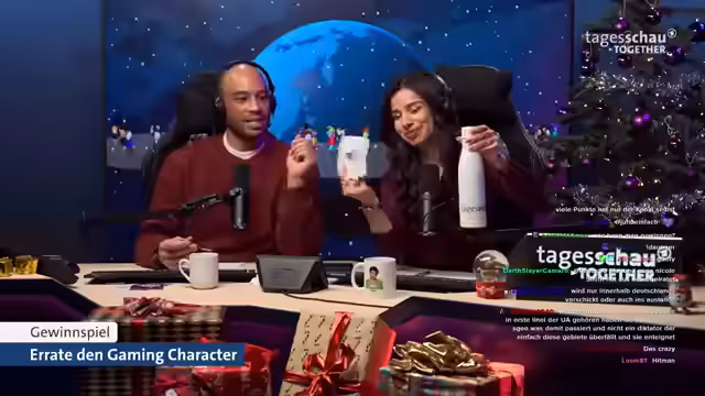 00:55:09Die Moderatoren Hanin und Felix begrüßen die Zuschauer zu einer neuen Ausgabe von TagesschauTogether, dem interaktiven Community-Format der Tagesschau. Sie kündigen ein XXL-Weihnachtsgewinnspiel an, bei dem eine spezielle Tasse, eine Tagesschau-Flasche und neue Susanne-Daubner-Sticker verlost werden. Um teilzunehmen, müssen die Zuschauer einen Videospielcharakter erraten, zu dem Susanne Daubner drei Tipps geben wird. Die Teilnahme erfolgt durch das Senden eines Faxes mit der richtigen Antwort, wofür 300 Channel Points benötigt werden. Zudem werden wichtige nachrichtliche Themen besprochen, darunter der EU-Gipfel und die Unterstützung der Ukraine, insbesondere die Frage, was mit dem eingefrorenen russischen Vermögen geschehen soll. Die Moderatoren betonen die Bedeutung der Zuschauerfragen an die Korrespondenten zu diesen Themen.