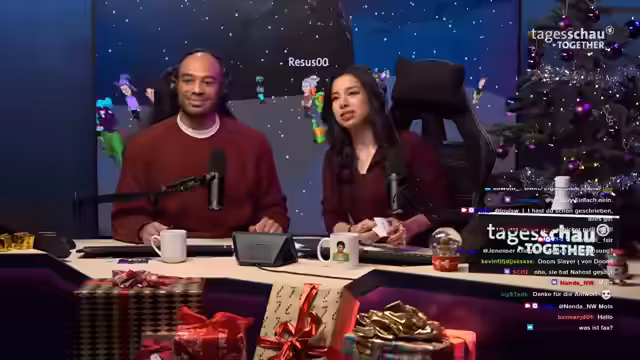00:33:45Die Moderatoren kündigen ein XXL-Weihnachtsgewinnspiel an, bei dem es insgesamt sechs Preise zu gewinnen gibt. Der Hauptpreis umfasst eine Susanne-Daubner-Tasse, eine Tagesschau-Flasche und exklusive Susanne-Daubner-Sticker, darunter ein besonderer Holo-Sticker. Die weiteren fünf Preise bestehen aus der Flasche und den Stickern. Die Teilnahme erfolgt über ein Rätsel, bei dem ein Gaming-Charakter erraten werden muss. Susanne Daubner liefert dazu drei Hinweise im Laufe des Streams. Zuschauer können ihre Antworten über ein „Fax“ einreichen, das durch das Sammeln von 300 Kanalpunkten aktiviert wird. Diese Punkte können durch Folgen oder Chat-Beteiligung gesammelt werden. Die Moderatoren weisen darauf hin, dass es sich lohnt, Faxe für spätere Hinweise aufzusparen. Zudem wird die Möglichkeit vorgestellt, sich als Avatar im Stream zu personalisieren und einzublenden, was durch Klicken auf den „Jetzt aktivieren“-Button im ARD-Logo auf dem Handy oder im Stream möglich ist. Grüße aus Luxemburg werden übermittelt, und Felix wird gebeten, seinen roten Pulli anzuziehen, was er nach der Tagesschau tun wird.