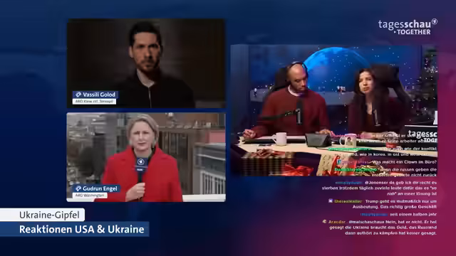 01:02:04Die Moderatoren präsentieren die neuen Sticker, die im Gewinnspiel enthalten sind, darunter ein Holo-Sticker. Es wird eine Frage aus dem Chat aufgegriffen, ob eine Tasse an den Kameramann von Korrespondentin Gudrun Engel geschickt wurde, was bestätigt wird. Anschließend wird ein Ausblick auf die noch zu besprechenden Hauptthemen gegeben: das russische Vermögen mit Vassili Gullert aus der Ukraine und Gudrun Engel aus den USA, die Lage in Nahost und ein weihnachtlicher Beitrag aus dem ARD-Studio in London. Die Moderatoren lesen einige Faxe vor, die nichts mit dem Gewinnspiel zu tun haben, und erinnern daran, die Faxe nicht zu verschwenden. Eine Umfrage zur Weihnachtsstimmung im Chat zeigt gemischte Reaktionen, wobei die Moderatoren selbst unterschiedliche Gefühle zum Thema Weihnachten äußern. Ein technischer Hinweis zur Teilnahme am Gewinnspiel über das Handy wird gegeben, falls das ARD-Logo nicht anklickbar ist.