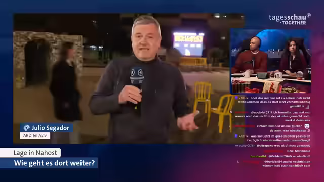01:38:29Das Team kündigt ein Weihnachts-Gewinnspiel an, bei dem es eine Tagesschau-Tasse, eine Flasche und ein Sticker-Set mit neuen Jugendwörtern und Susanne Daubner-Motiven zu gewinnen gibt. Insgesamt werden sechs Gewinner gekürt, wobei der Hauptpreis alle drei Artikel umfasst und fünf Trostpreise die Flasche und die Sticker enthalten. Die Teilnahme erfolgt durch das Faxen der richtigen Antwort auf eine Rätselfrage, wofür Channel-Punkte benötigt werden. Anschließend wird eine Live-Schalte zu Korrespondent Julio Segador in Tel Aviv hergestellt, um ein Update zur Lage in Nahost zu geben. Segador berichtet vom Hostage Square, dem Geiselplatz, wo ein nachgebauter Hamas-Tunnel und eine Uhr, die die seit dem 7. Oktober 2023 vergangene Zeit anzeigt, die Erinnerung an die Geiseln wachhalten. Er erwähnt auch ein Klavier, das zu Ehren des freigelassenen deutsch-israelischen Pianisten Alon Noel aufgestellt wurde.