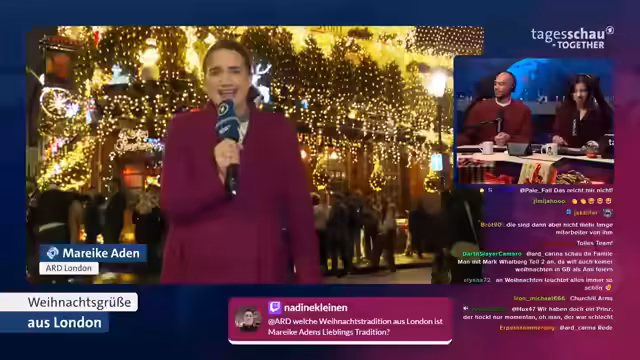 01:47:02Auf die Frage nach Protesten gegen Benjamin Netanjahu und die Zustimmung zu seiner Regierung erklärt Julio Segador, dass nach der Waffenruhe eine Atempause eingetreten sei, es aber möglich sei, dass sich aus der pro-Geisel-Bewegung eine Anti-Netanjahu-Bewegung formiert, insbesondere im Hinblick auf die Wahlen im nächsten Jahr. Die Zukunft des Gazastreifens, so Segador, werde maßgeblich in den USA entschieden, wo Benjamin Netanjahu und möglicherweise der ägyptische Präsident Assisi mit Donald Trump über einen Friedensplan verhandeln werden. Anschließend schaltet der Stream zu Mareike Aden in London, die vor einem festlich geschmückten Pub in Notting Hill über Weihnachtstraditionen berichtet. Sie erwähnt, dass Londoner Weihnachten maximalistisch feiern, ohne Angst vor Kitsch, und dass der 25. Dezember der wichtigste Tag für Geschenke ist, während der 26. Dezember, der Boxing Day, für Shopping genutzt wird.