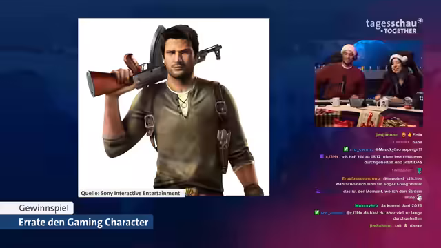 02:00:37Mareike Aden erklärt die Herkunft des 'Boxing Day', der auf eine alte Tradition zurückgeht, bei der Arbeitgeber ihren Dienern Geschenke in Boxen überreichten. Sie teilt auch persönliche Einblicke in ihre Weihnachtserfahrungen, wobei sie die britische Tradition, Weihnachten im Schlafanzug zu feiern, als faszinierend und schockierend zugleich empfand. Nach der Schalte nach London wird das Weihnachts-Gewinnspiel fortgesetzt, bei dem die Teilnehmer einen Gaming-Charakter erraten müssen. Die Hinweise, darunter eine Beschreibung des Charakters und die Erwähnung seines Partners Victor 'Sully' Sullivan, führen zur Auflösung: Gesucht wird Nathan Drake aus der 'Uncharted'-Reihe. Das Team verlost den Hauptpreis (Tasse, Flasche, Sticker-Set) und fünf Trostpreise (Flasche, Sticker-Set) unter den Teilnehmern, die die richtige Antwort gefaxt haben. Die Gewinner werden live im Stream gezogen und aufgefordert, eine Flüsternachricht zu senden, um ihre Preise zu erhalten. Abschließend bedankt sich das Team bei der Community, den Mods und der Regie und gibt einen Ausblick auf kommende Streams auf dem ARD Twitch-Kanal, darunter ein In Real Life Stream vom MDR Sputnik DJ Konzert und die Sportschau zum letzten Bundesliga-Spieltag vor der Winterpause.