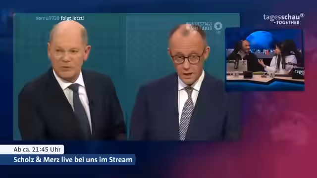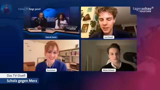 00:14:56Der Tagesschau-Together-Stream ist zurück, um gemeinsam das TV-Duell zwischen Olaf Scholz und Friedrich Merz zu schauen. Tanin und Felix begrüßen die Zuschauer und kündigen an, dass Eva Schulz, Hedgefond Henning und Levi Pennell als Gäste dabei sind. Zudem sollen Scholz und Merz nach dem Duell exklusiv für Fragen der Zuschauer zur Verfügung stehen. Hand of Blood ist krankheitsbedingt abwesend. Der Stream ist auf verschiedenen Plattformen wie Twitch, YouTube, Instagram, TikTok und ARD Mediathek verfügbar. Die Zuschauer werden ermutigt, sich zu beteiligen und ihre Avatare anzupassen. Es wird auf Ton- und Videoprobleme hingewiesen, an deren Behebung gearbeitet wird. Eine erste Abstimmung soll bald starten, um herauszufinden, ob die Zuschauer bereits wissen, welche Partei sie wählen werden. Die Gäste Eva Schulz (Politikjournalistin), Niklas alias Hedgefonds-Henning (bekannt von Instagram und TikTok) und Levi Pennell (TikTok-Creator) werden begrüßt und kurz vorgestellt.