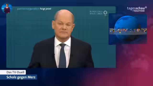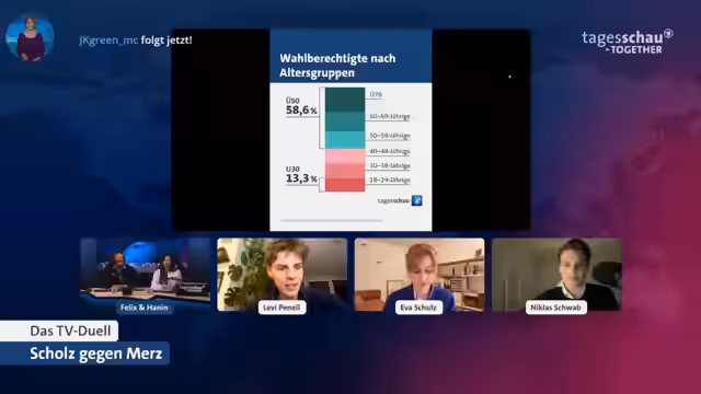 00:57:00Unmittelbar nach dem TV-Duell werden die Kandidaten direkt ins Studio kommen, um Fragen aus dem Chat zu beantworten. Zuschauer sind aufgerufen, ihre Fragen im Chat zu stellen. Enge Mitarbeiter der Kandidaten sind bereits vor Ort, während Scholz und Merz in einer separaten Etage untergebracht sind, wo sie sich vorbereiten und in die Maske gehen. Es gibt Currywurst und Schnittchen. Im Vergleich zum Duell vor vier Jahren sind die Sicherheitsvorkehrungen erhöht. Amelie gab Einblicke vor Ort und wird später wieder zugeschaltet. Die Teilnehmenden sprechen über die Themen Mietpreise, Lebenserhaltungskosten und steigende Energiepreise. Es wird eine Deutschland3000-Folge geben, die sich mit den klimapolitischen Positionen der Parteien auseinandersetzt und Unterschiede zwischen Union und SPD aufzeigt, insbesondere in der Verkehrs- und Klimageldpolitik. Die geringe Wahlbeteiligung von unter 30-Jährigen (13,3 Prozent) wird diskutiert. Es wird vermutet, dass ältere Menschen die Interessen ihrer Kinder und Enkelkinder berücksichtigen. Das Wahlverhalten junger Menschen hat sich angeglichen, da sie nicht mehr nur Grün, sondern auch AfD wählen.