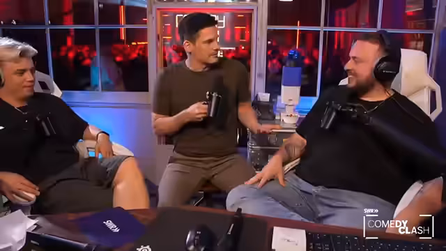 00:37:28Es entwickelt sich eine spontane Idee: @papaplatte und Dominik planen eine Zusammenarbeit bei künftigen Auftritten, insbesondere in der Lanxess Arena. Dominik, eigentlich Sanitärinstallateur, möchte von @papaplatte in die Welt der Stand-up-Comedy eingeführt werden. Es wird diskutiert, dass Dominik zuerst bei Open-Mic-Veranstaltungen Erfahrungen sammeln sollte, bevor er größere Bühnen betritt. Die Moderatoren streben an, eine gemeinsame Nummer zu entwickeln.