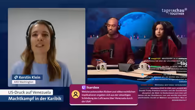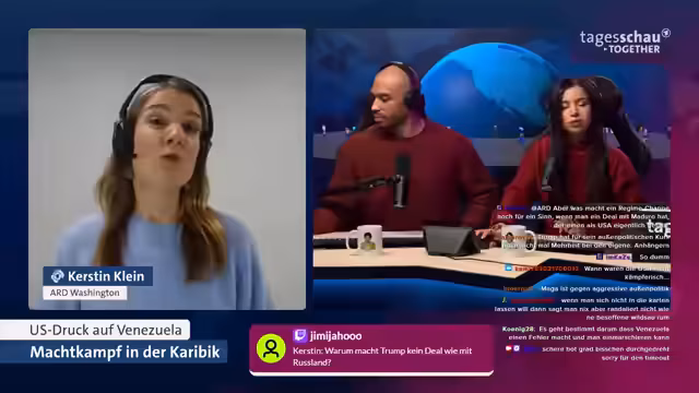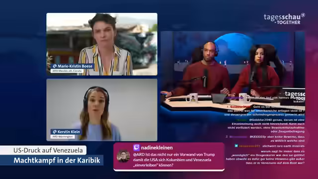 00:45:35Hanin und Felix begrüßen die Zuschauer zurück und erinnern an das Gewinnspiel der Susanne-Daubner-Tasse. Sie wiederholen den ersten Hinweis zum Gaming-Charakter: „Die Figuren mäßig hätte ich gern. Es lohnt sich doch, Sport zu machen. Hat ein bisschen was von Schwarzenegger, sehr markantes Kinn. Bild entschlossen, aber im Dunkeln möchte ich dem nicht begegnen.“ Anschließend präsentieren sie den zweiten Hinweis: „Schwer bewaffneter Mann mit sechs Patronen. Das Tanktop, ehrlich gesagt, finde ich ein bisschen überdenkenswert. Also rot.“ Die Zuschauer werden ermutigt, ihre fünf Faxe mit den Antwortmöglichkeiten zu senden, um in die Verlosung zu kommen. Danach leiten die Moderatoren zum ersten Hauptthema über: den Konflikt zwischen den USA und Venezuela. Sie erklären, dass die USA Druck auf Venezuela ausüben und mutmaßliche Drogenschmuggelschiffe angreifen, was zu Kritik am US-Kriegsminister Hexer führt. Zur Klärung der Situation werden die US-Korrespondentin Kerstin Klein und die Korrespondentin Marie-Christin Böse, die sich an der Grenze zu Venezuela befindet, zugeschaltet.