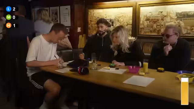 01:11:39Das Kneipenquiz startet mit einer Buzzer-Runde aus zehn schnellen Fragen. Henke nutzt seinen Vorteil und gewinnt sofort die erste Frage nach der Hauptstadt von Hessen. Die zweite Frage, nach dem Namen von Montana Blacks Hund, löst ebenfalls Henke auf, als er 'Kylo' als korrekte Antwort nennt. Nach einer kurzen Diskussion mit der Regie wird die Antwort als gültig anerkankt. Henke hat somit bereits zwei Punkte in der Quiz-Runde gesichert. Der Modus der Buzzer-Fragen wird definiert, dass bei Fehlern eine Nachfrage möglich ist.