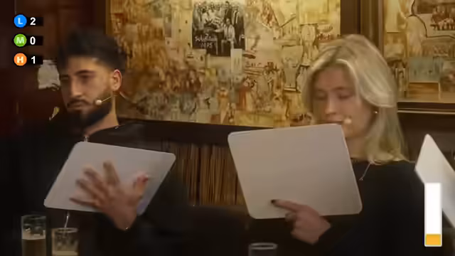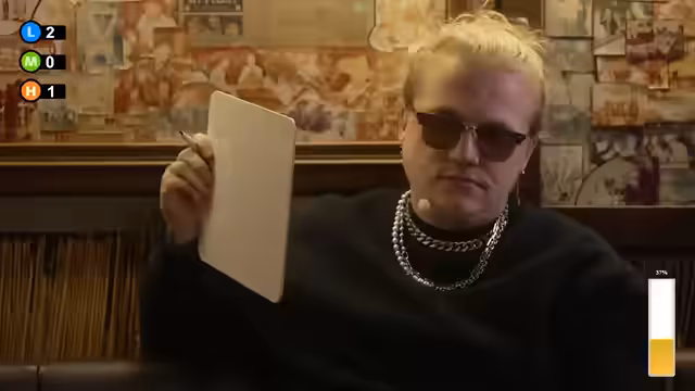 01:15:34Das Quiz beginnt mit den ersten Fragen. Henke und Merle nutzen den Buzzer, wobei Henke mit zwei Fragen vorne liegt. Merle versucht erfolglos, mit dem Kopf auf den Tisch zu buzzern. Die Fragen decken Themen wie TikTok, den 1Live-Sektor und die meistverkaufte Buchreihe im 21. Jahrhundert ab, wobei Henke und Leser korrekte Antworten geben. Merle bleibt ohne Punkte und äußert sich frustriert. Der aktuelle Spielstand im Quiz ist Henke 3, Leser 2, Merle 0. In der Gesamtwertung führt Leser mit 2 Punkten vor Henke (1) und Merle (0).