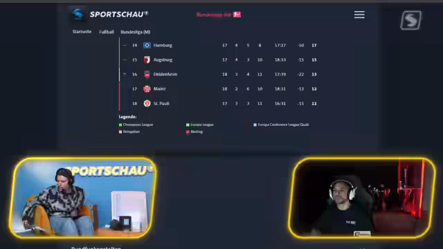 02:21:00Am Ende des Streams werden kurze Nebenthemen behandelt. Friedrich Merz erhält im Stadion Dortmund den 'Großen Stutenkerl', eine Auszeichnung der Bäckerinnung, die mit dem Bundesverdienstkreuz verglichen wird. Es folgt ein Ausblick auf das Abendspiel zwischen RB Leipzig und Bayern München. Die Tabellenlage wird final aktualisiert: Wolfsburg auf Rang 11, Köln auf 13, Mainz auf 15. St. Pauli bleibt mit 12 Punkten auf dem letzten Platz. Der Stream endet mit einer Zusammenfassung der wichtigsten Spielergebnisse und der Aufforderung an den Chat, weiterhin die Spiele zu verfolgen und an Diskussionen teilzunehmen.
