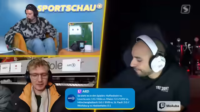 00:04:20Die Sportschau Live auf Twitch wird am 18. Spieltag der Bundesliga begrüßt. Malde empfängt die Zuschauer und erklärt, dass der Stream samstags ab 14:30 Uhr startet. Er betont, dass sie schneller als Pay-TV-Anbieter sind, insbesondere bei Toren und VAR-Entscheidungen. Mo Ober wird als einer der besten EAFC-Spieler und Streamer der Welt vorgestellt, der sich dem Stream anschließen wird. Die wichtigsten Spiele des Tages werden aufgezählt, darunter Hoffenheim gegen Leverkusen und Dortmund gegen St. Pauli.