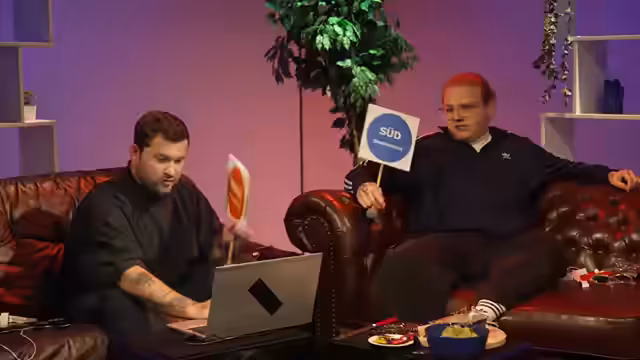 01:08:09Es beginnt das große Norddeutschland gegen Süddeutschland-Battle, bei dem Henke und Fridl verschiedene Themen gegeneinander abwägen und objektiv ranken sollen. Fridl moderiert den Vergleich enthusiastisch und lädt den Chat zur Teilnahme ein. Beim ersten Punkt, Nordsee gegen Alpen, erkennen beide, dass eine Entscheidung unmöglich ist, und bleiben unentschieden. Auch bei folgenden Themen wie Liegestuhl am Berg gegen Strandkorb oder Santiano gegen LaBras Banda sind die Meinungen geteilt und es entsteht ein lebhafter, humorvoller Schlagabtausch.