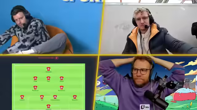 00:50:28Vor dem Beginn der Spiele wird ein interaktives Spiel durchgeführt, bei dem Nils und Malte gemeinsam fünf Spieler auswählen müssen, die Moritz während des Kommentierens bewertet. Nils beginnt mit der Wahl und entscheidet sich für einen Spieler des FC Bayern, während der Chat Vorschläge für Leverkusener Spieler liefert, darunter Poku, Schick und Leimer. Das Spiel dient als lockere Einstimmung auf die anstehenden Partien und schafft eine direkte Interaktion mit dem Publikum.
