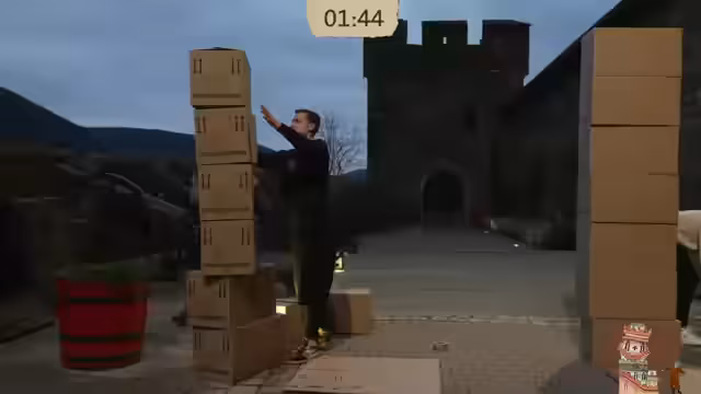 02:04:58Die Teams treten in einer Challenge an, bei der sie innerhalb von fünf Minuten aus Umzugskartons einen möglichst hohen Turm bauen müssen. Als Hilfsmittel steht ihnen breites Paketband zur Verfügung. Die Türme müssen ohne Festhalten stehen bleiben, und Sabotage ist nicht erlaubt. Nach einer fairen Begrüßung beginnt die Challenge. Ein Juror gibt Profi-Tipps zum Zusammenbau der Kartons, die er für unnötig hält. Team Kroko liegt zunächst vorne, aber Team Dagi holt auf. Es wird überlegt, ob die Teams alle Kisten fertig bauen oder direkt stapeln sollen. Der Juror gibt weitere Tipps zur Stabilisierung der Türme. Kurz vor Schluss ist Team Dagi höher, aber es kommt eine Windböe auf. Team Kroko verstärkt das Fundament doppelt, während Team Dagi riskiert. Am Ende gewinnt Team Dagi mit einem knappen Vorsprung von 3 cm, da ein Karton schräg auf dem Turm landete. Team Kroko muss für 10 Minuten in den Observer-Modus. Der Juror zählt die Kisten nach, um sicherzustellen, dass alles korrekt abgelaufen ist. Team Kroko erklärt seine Strategie und Tricks, die er noch gehabt hätte, wie z.B. das Abspannen mit Heringen im Boden.