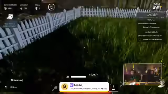 01:15:30Die Interaktion mit dem Chat ist ein ständiger Begleiter. Durch Vorteilsfragen werden humorvolle und skurrile Einlagen gestartet, wie z.B. romantische Anmachsprüche mit Gärtnern-Bezug oder die Frage nach dem höchsten Punkt einer Gärtnerin. Die wiederkehrende, lustige Chat-Frage „Fickende Leute in meinem Garten“ und die Erwähnung von „Castaway“-Ball „Wilson“ sorgen für eine lockere Atmosphäre.