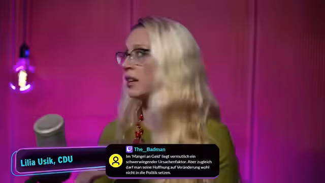 00:10:04Der Stream beginnt mit der Einführung des Themas Einsamkeit, einem Gefühl, das viele junge Menschen betrifft, sei es nach einem Umzug in eine neue Stadt, inmitten einer vollen WG oder nach stundenlangem Scrollen auf Social Media. Es wird betont, dass Einsamkeit weitreichende Folgen für Gesundheit, Wirtschaft und Gemeinschaft haben kann, da sie das Vertrauen in sich selbst, andere und die Demokratie mindert. Als Gäste sind Lilia Usik, CDU-Abgeordnete und jugendpolitische Sprecherin aus Berlin, sowie Elias Jessen, Doktorand an der Charité Berlin im Bereich digitale Prävention, anwesend. Beide teilen ihre persönlichen Erfahrungen mit Einsamkeit. Elias beschreibt Einsamkeit als ein Ungleichgewicht zwischen gewünschten und tatsächlich vorhandenen qualitativen oder quantitativen Beziehungen. Lilia erinnert sich an Phasen der Einsamkeit als Teenagerin nach dem Umzug ihrer besten Freundin und betont die Unterscheidung zwischen gewollter Alleinsein und dem schambehafteten Gefühl der Einsamkeit. Auch der Einfluss von Sprachbarrieren und Integrationsschwierigkeiten wird als Auslöser für Einsamkeit thematisiert, wobei Lilia eine persönliche Anekdote über Schwierigkeiten beim Humor in einer Fremdsprache teilt. Der Chat wird aktiv zur Teilnahme und zum Teilen eigener Erfahrungen aufgerufen, wobei Hilfsangebote im Chat bereitgestellt werden.