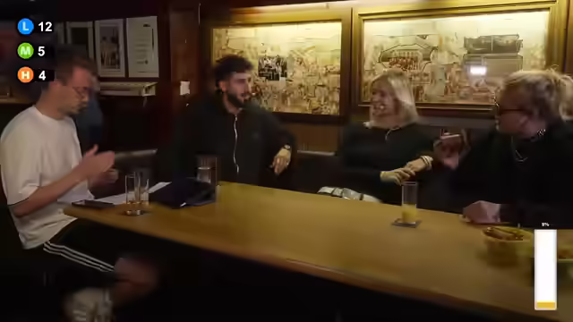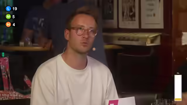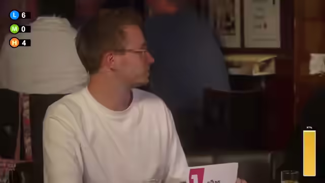 00:00:02Der Livestream startet mit einem Kneipenquiz, bei dem die Anzahl der Kneipen in Köln geschätzt werden soll. Die korrekte Antwort liegt bei 828 Kneipen im Jahr 2021. Es folgt eine Popkultur-Frage zur Serie 'Der Sommer, als ich schön wurde', gefolgt von Fragen zum neuen Album von Sabrina Carpenter und der korrekten Schreibweise von 'Sahide'. Eine Schätzfrage zur Anzahl verschiedener Getränke im Berggrug wird gestellt, die korrekte Antwort lautet 67. Leser und Merle erhalten jeweils einen Punkt für ihre Schätzungen. Henke gewinnt das Quiz mit 18 Punkten, gefolgt von Leser mit 10 und Merle mit 11 Punkten. Abschließend wird angekündigt, dass die nächsten Spiele mehr auf Geschicklichkeit als auf Wissen basieren werden, beginnend mit Wettsaufen.