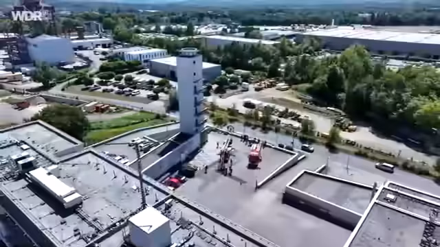 01:01:56Nachdem alle sichergestellt sind, beginnt die Fahrt mit der Drehleiter nach oben. Der主播 erwähnt, dass die Leiter bis zu 30 Meter ausgefahren werden kann und man viel Vertrauen in die Technik haben muss. Auf 30 Meter Höhe angekommen, haben sie einen tollen Weitblick über Bochum und Umgebung. Mit Hilfe von Sprechverbindung zum Kollegen am Boden wird die Leiter gesteuert. Es wird versucht, den Balkon eines fiktiven Objektes zu erreichen, um eine simulierte Rettung durchzuführen und den praktischen Nutzen der ausfahrbaren Leiter zu demonstrieren.