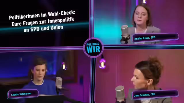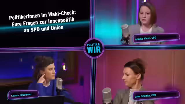 00:09:56Die Sendung 'Politik & Wir' startet mit einer Begrüßung der Zuschauer und einer Ankündigung des Themas: Innenpolitik mit Fokus auf CDU und SPD. Die Moderatorin betont die Möglichkeit für die Zuschauer, live Fragen zu stellen und ihre Wahlentscheidung zu überdenken. Es werden die beiden Gäste vorgestellt: Annika Klose (SPD), Bundestagsabgeordnete, und Jana Schimke (CDU), ebenfalls Bundestagsabgeordnete. Beide Politikerinnen werden kurz vorgestellt, inklusive einiger persönlicher Details, um sie dem Publikum näherzubringen. Anschließend wird nach den meistgestellten Fragen im Wahlkampf gefragt. Klose berichtet von der Besorgnis der Menschen bezüglich steigender Mieten in Berlin-Mitte, während Schimke von der häufigen Frage nach möglichen Koalitionen berichtet. Beide Politikerinnen geben erste Einblicke in ihre Schwerpunktthemen und Positionen. Lukas, ein 26-jähriger Geografie-Student, wird als erster Zuschauer zugeschaltet, um seine Eindrücke vom Wahlkampf zu schildern. Er empfindet den Wahlkampf als polarisierend und kritisiert das Übergewicht populistischer Themen wie Migration gegenüber sozialen Fragen und Klimaschutz.