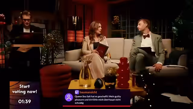 01:55:22Nach einer kurzen technischen Verwirrung geht es mit dem Voting weiter. Die Niederlande werden als potenzieller Überraschungskandidat vorgestellt, dessen Song textuell einfach und eingängig ist. Die Moderation fragt, ob ein so 'beliebiger' Song wie 'La La La' bei einem Kopf-an-Kopf-Rennen zwischen den Favoriten als Konsensgewinner durchsetzen könnte. Der Beitrag aus Finnland, interpretiert von der charismatischen Erika Wigmann, wird als bombastische und ikonische Show mitJennifer-Coolidge-Vibes gelobt. Ein 'scary Moment' während des Auftritts, bei dem sie erschrocken auf ein Knallgerächt reagierte, wird von ihr selbst geteilt und im Chat kontrovers diskutiert.