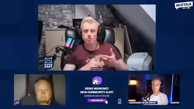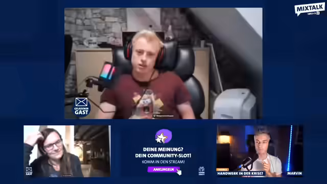 00:10:28Der Stream beginnt mit einer Begrüßung durch den Moderator Marvin beim ARD-Mixtalk zum Thema 'Ist unser Handwerk in der Krise?'. Initial wird die Hitzewelle thematisiert und die Zuschauer nach ihrem Aufenthaltsort befragt. Hauptaugenmerk liegt auf einer interaktiven Abstimmung im Chat, um herauszufinden, ob die Zuschauer ein Studium (1) oder eine Ausbildung (2) gemacht haben. Die Ergebnisse sind durchmischt, was die Vielfalt der Bildungswege im Publikum widerspiegelt.