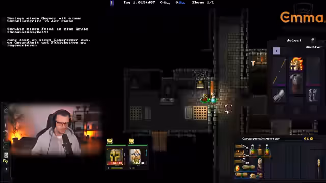 04:48:58Es wird erklärt, wie man das Spiel auf Deutsch umstellen kann, indem man die Sprache im Hauptmenü auswählt. Das Releasedatum des Spiels wird mit dem zweiten Quartal 2025 angegeben. Ein neuer Dungeon mit Metalltüren wird betreten und erkundet. Der Magier erhält viel Schaden und muss außerhalb des Kampfes gehalten werden. Ein Baum wird gefunden und zusätzliche Erfahrung wird gesammelt. Mehrere Gegner werden gleichzeitig angegriffen, wobei der Magier mit guten Schüssen überzeugt. Nach einem Kampf können sich die Charaktere ausruhen und es wird sehr viel Loot gefunden. Es wird überlegt, wer welche Ausrüstung erhalten soll, wobei der Fokus auf Abwehr und Stärke liegt. Ein Feuerblitz wird eingesetzt, um Gegner zu besiegen. Der Kampfpriester überzeugt als Tank und Krieger. Ein Charakter stirbt im Kampf, kann aber durch eine Fähigkeit des Priesters wiederbelebt werden. Der Magier muss aufgrund seiner geringen Lebenspunkte auf Distanz gehalten werden.