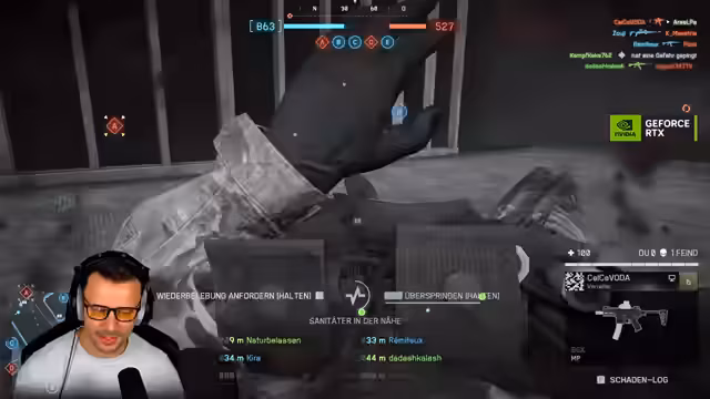 04:01:48Ein weiterer Schwerpunkt liegt der Interaktion mit den im Spiel verfügbaren Fahrzeugen, insbesondere Jets. Der Streamer testet deren Flugverhalten, Abwehrmaßnahmen wie Flares und den daraus resultierenden Schaden. Es werden Taktiken zum Abschuss von Jets erprobt und das Gameplay als "geil" und mit "Star Wars-Feeling" beschrieben, was die actiongeladenen Szenen unterstreicht.