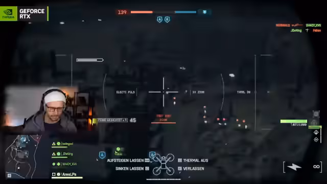 06:27:39Wechsel zu Fahrzeugaction mit Panzern und Helikoptern. Der Streamer testet die Steuerung, Reparaturmechaniken und Luftkämpfe. Besonders intensiv wird das Flugtraining auf Community-Servern ('Aircraft Training'), wo er Helikopter- und Jet-Steuerung (z.B. W/S für Höhe, A/D für Drehung) übt und Empfindlichkeiten anpasst, um schwierige Manöver wie Loopings zu meistern.